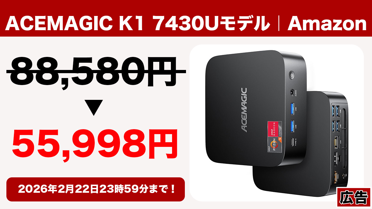 メモリ32GBで5.6万円!ミニPC「ACEMAGIC K1 7430Uモデル」が2月22日までセール!