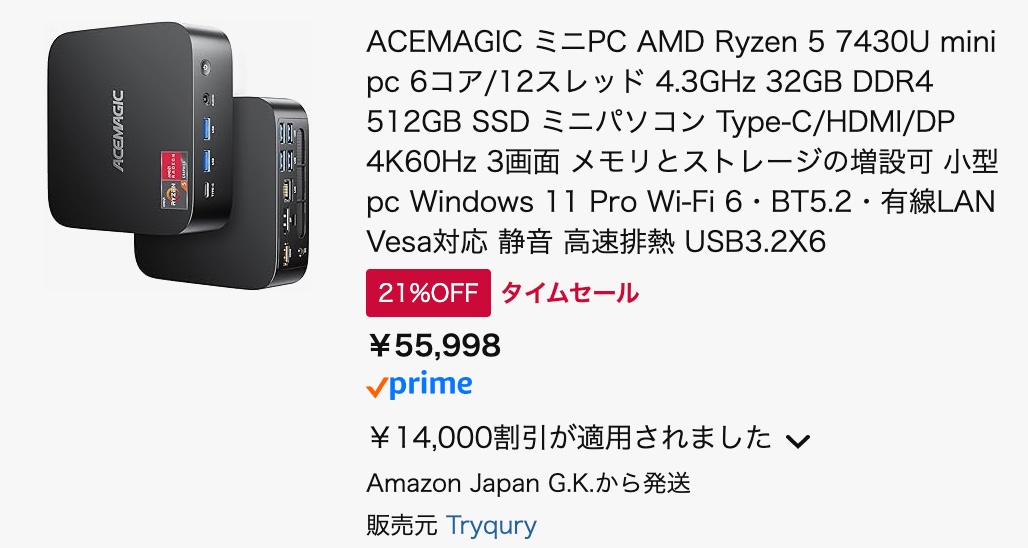 メモリをタップリ32GB搭載するミニPC「AMD Ryzen 5 7430Uモデル」が、Amazonで2月22日まで爆安セール中です!通常価格は8.8万円ですが、クーポン適用で55,998円に!パーツ高騰が続く今、このスペックで5万円台半ばは魅力的。