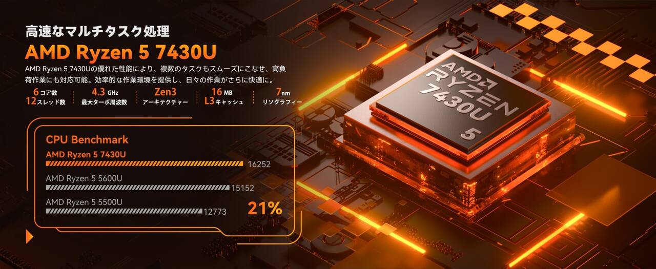▼CPUにはAMD Ryzen 5 7430Uを搭載。6コア12スレッドのZen 3世代プロセッサです。↓