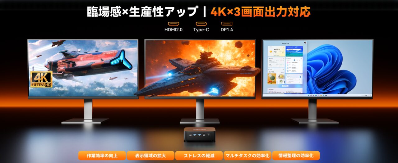 HDMI、DisplayPortに加え、フロントのUSB-C端子をフル活用することで広大な作業領域を確保できます。ただ、USB‐Cで出力すると前面からケーブルが常に伸びている状態なので少し見栄えが気になるかも。デスク周りをスッキリさせたいなら、背面の端子のみを使った2画面運用までが良いかもしれませんね。
