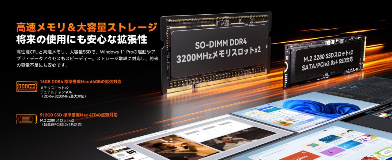 32GBもあれば、ブラウザでタブを大量に開いて、裏でOfficeソフトを動かすようなマルチタスクも余裕。ストレージは512GBですが、換装することもできます。