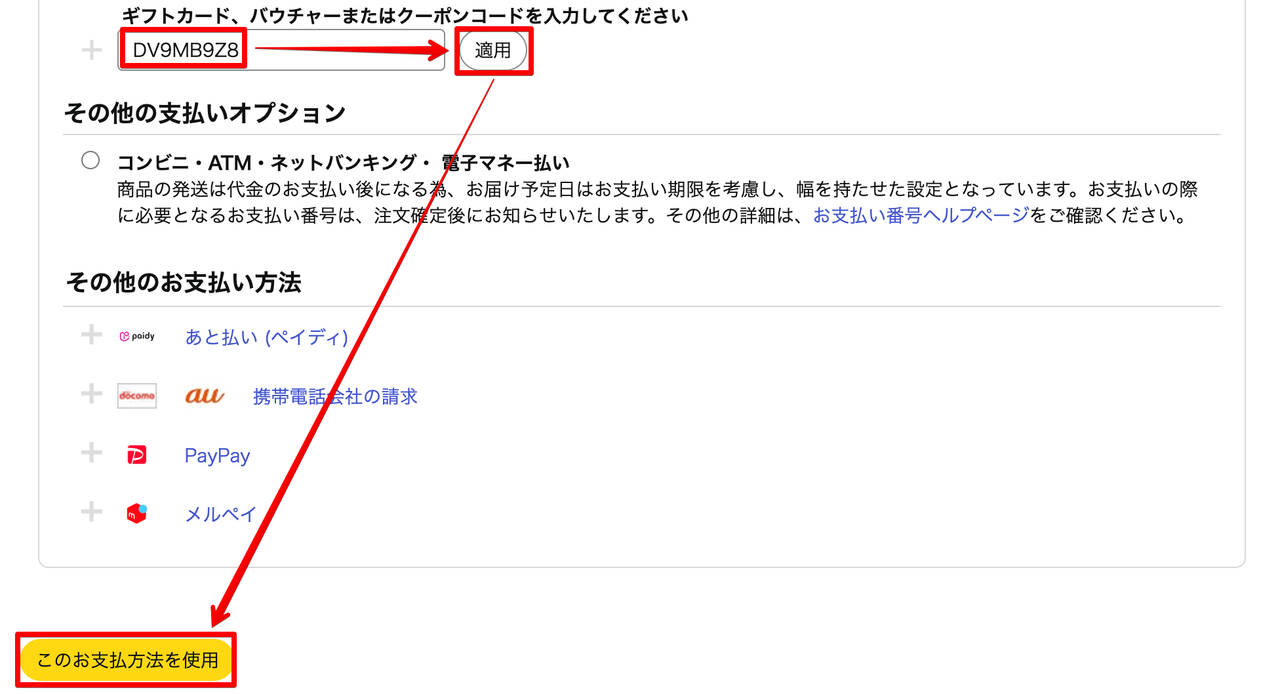 ▼カートに入れてレジへ進み、「ギフトカード、商品券、プロモーションコードを使用する」をクリック。以下の通りクーポンを適用しましょう!↓