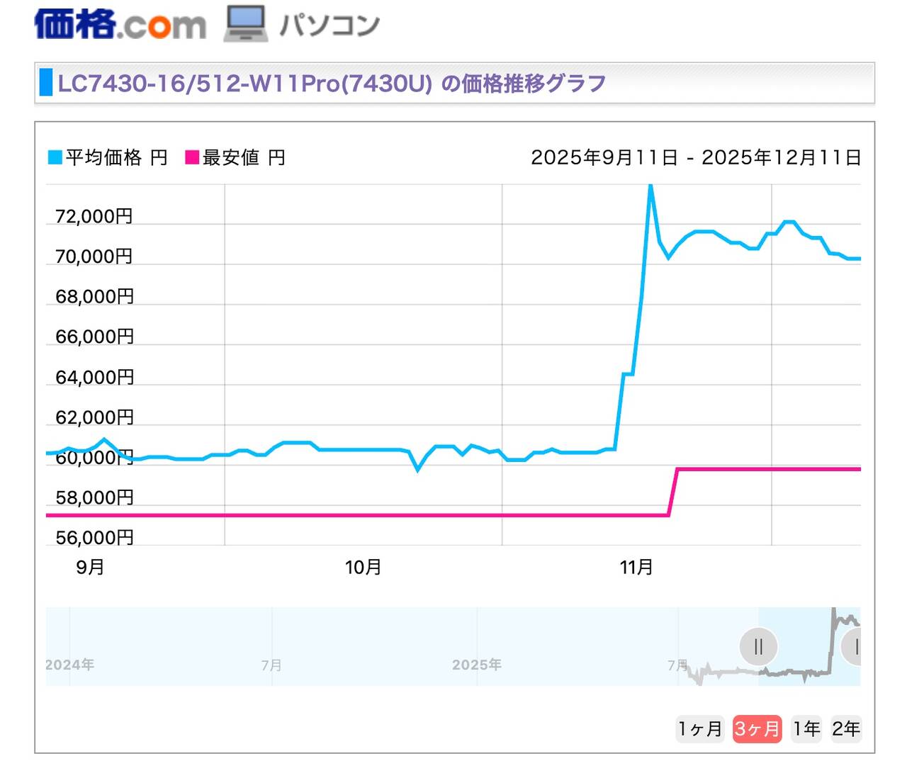 ▼これは価格.comで価格推移が確認できたRyzen 5 7430U搭載ミニPC製品のグラフなんですが、11月頃からドッカンと価格が上がってるのが分かるはず。悲しいですねぇ。↓
