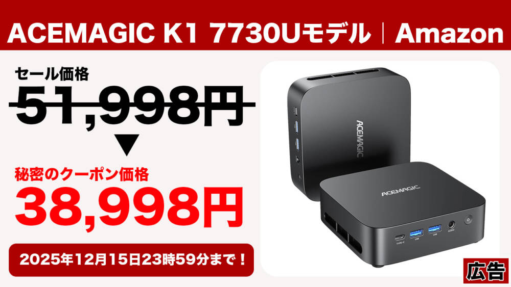 12月15日まで!ミニPC「ACEMAGIC K1 7730Uモデル」が大幅割引されるクーポン配布!