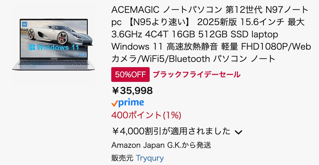 ちなみにブラックフライデー価格は39,998円ですが、本記事で配布している秘密クーポンを適用すると35,998円で購入できます。この記事にたどり着いた方はラッキー。