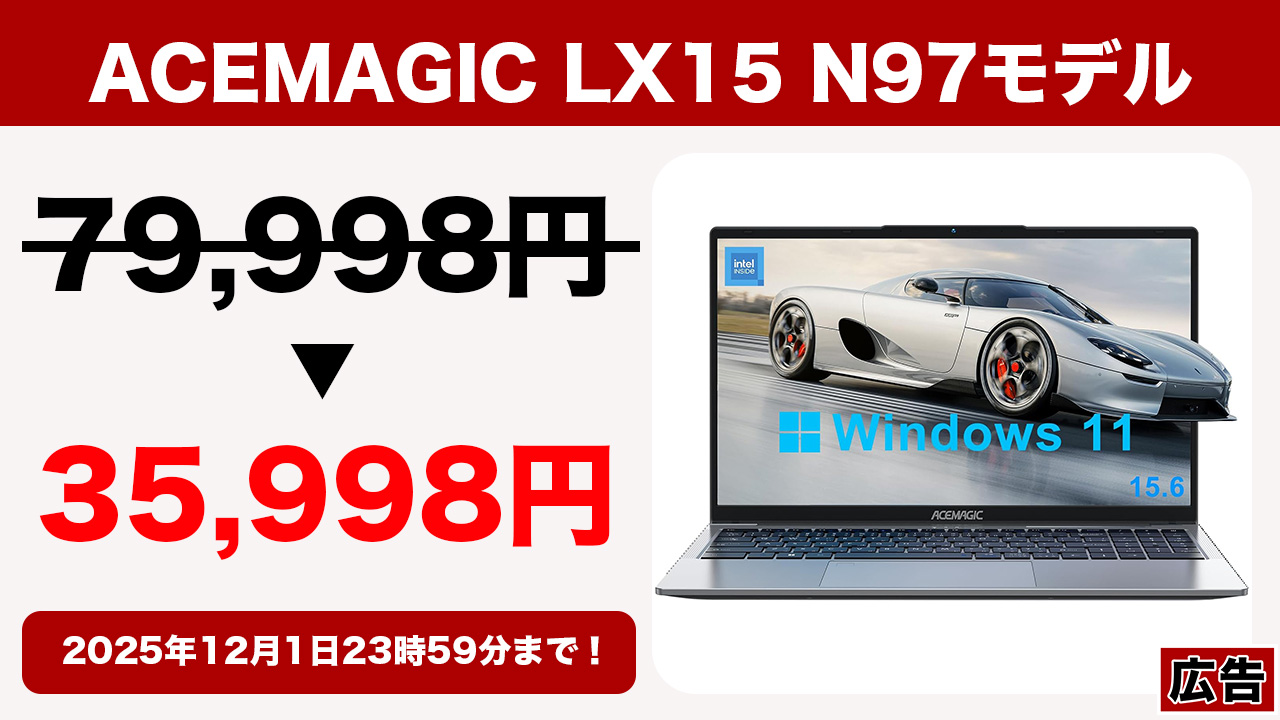 ミニPC以外にもノートPCも色々とリリースしているACEMAGICのエントリーモデル「LX15」のIntel N97搭載モデルがBlackFridayで割引中!お手頃価格でよく売れているモデルなので要チェックですよ!
