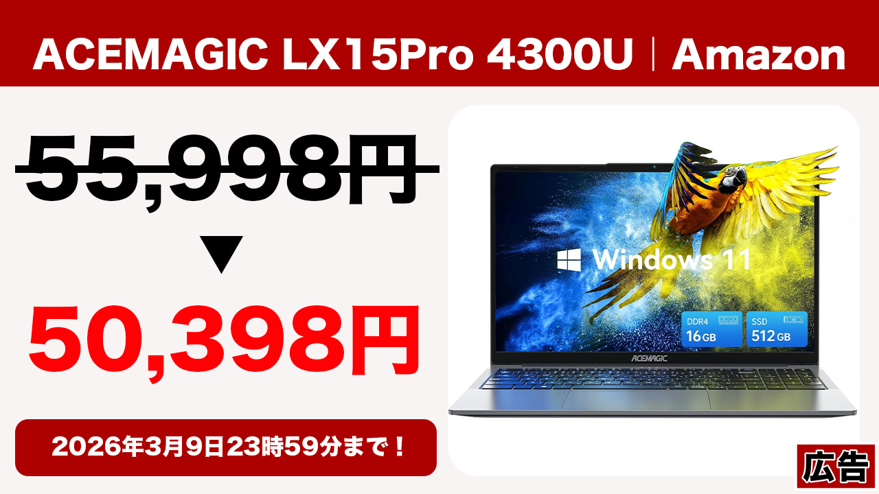 3月9日まで!15.6型ノートPC「ACEMAGIC LX15Pro 4300Uモデル」が5万円になってるぞ!