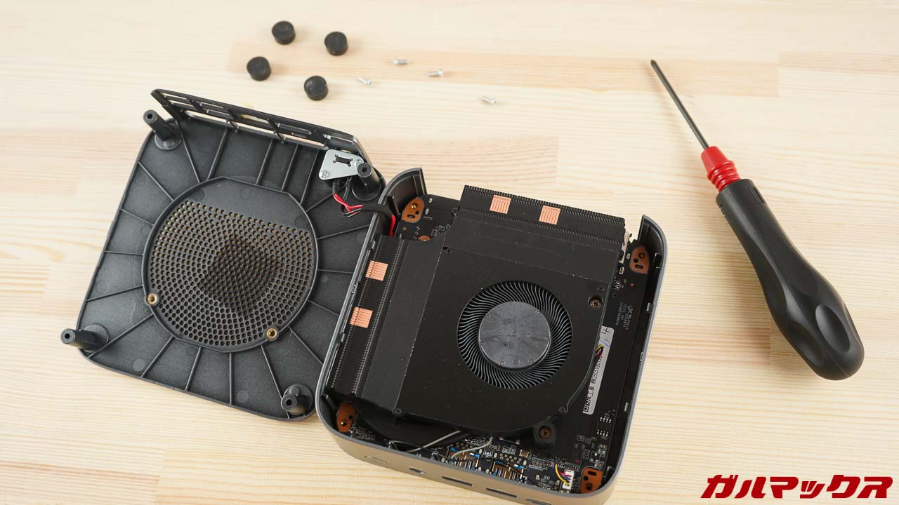 ▼底面の取り外し方はゴム足を取って4本のネジを外せばアクセスできます。が、ここまでの分解だとメモリやストレージにアクセスできません。↓