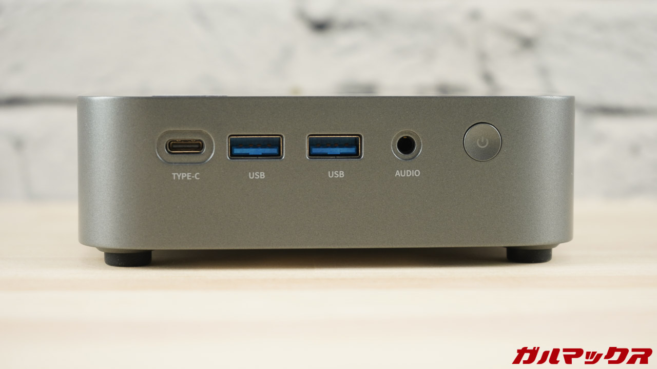▼フロントにはUSB 3.2(Type‐A)が2つ、USB 4(Type‐C)が1つに3.5mmオーディオポートが1つ。↓