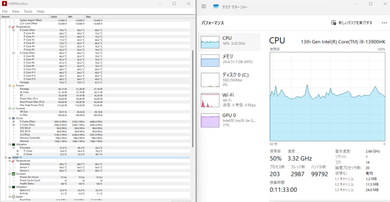 また、ベンチマークは上のほうにまとめて貼ってますが、同じ13900HKを搭載するモデルの中では若干スコアは低めかな?といった印象です。