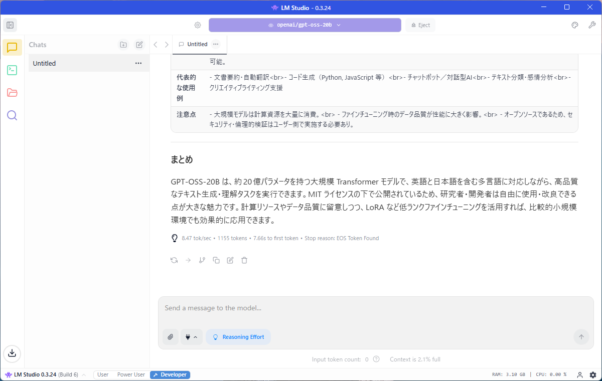 ▼特にエラーが出ることもなく検証完了。8.47 tok/secとなりました。↓