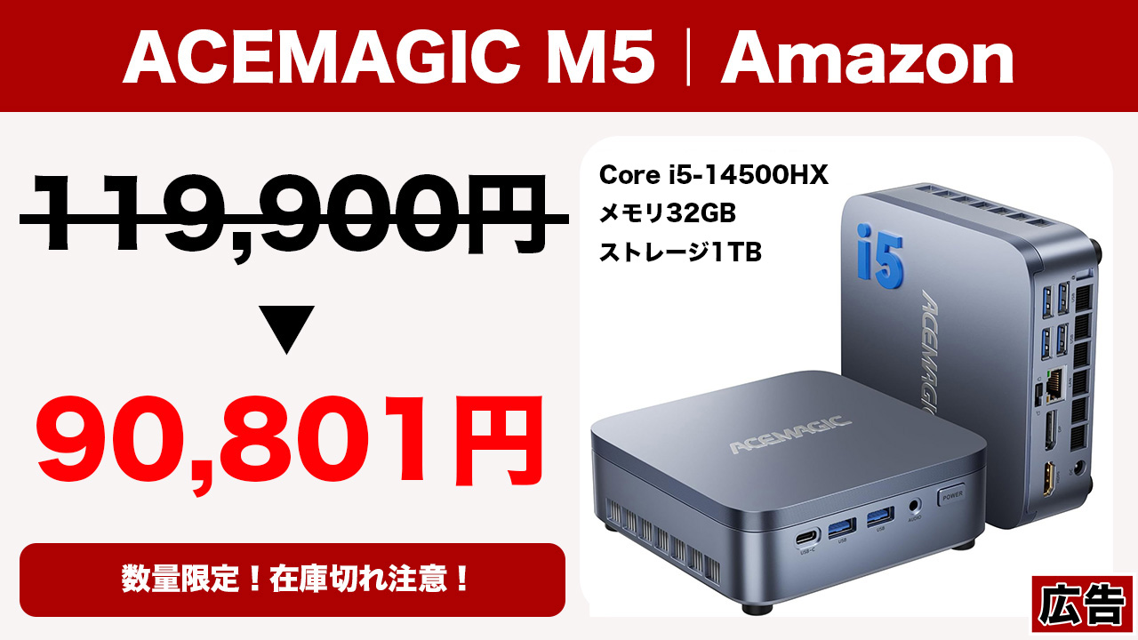 ACEMAGICのCore i5-14500HXを搭載したミニPC「M5」がAmazonにてセール開催中との情報をいただきましたので、本記事で紹介していきます!
