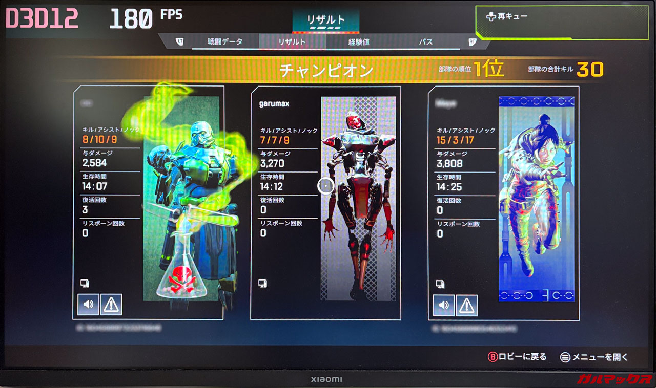 ▼プレイは全く問題ないですね。チャンピョン余裕でした。という訳でAPEXは普通にプレイを楽しめます。↓