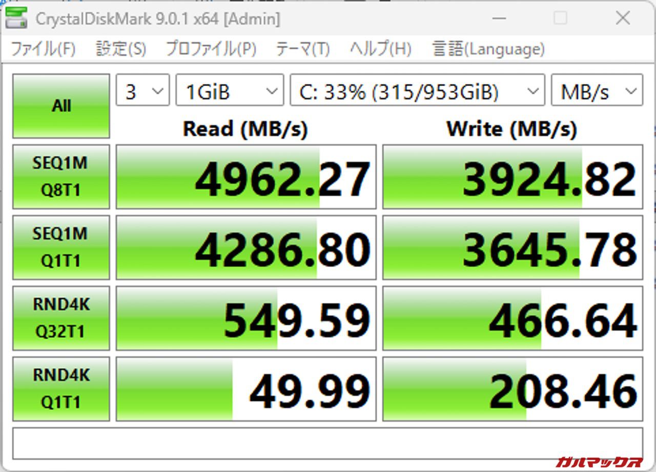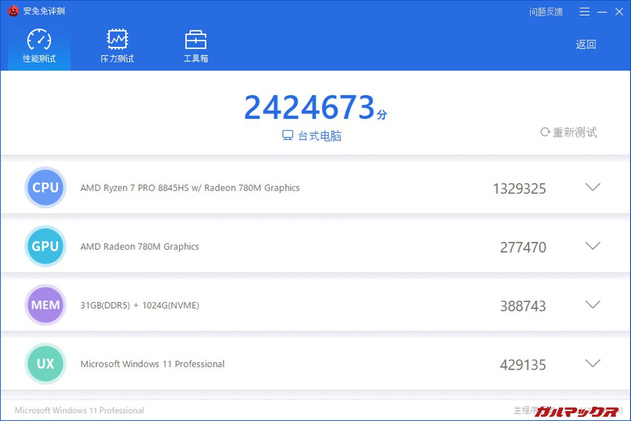 動作モードはバランスモードとパフォーマンスモードで性能の違いを感じられない点は微妙でしたが、Ryzen 7 8845HSらしい性能は発揮できているモデルなので良しとしてます。
