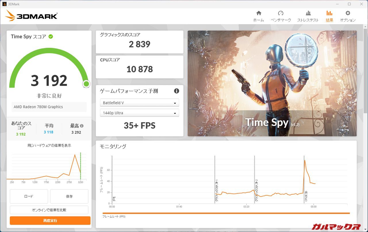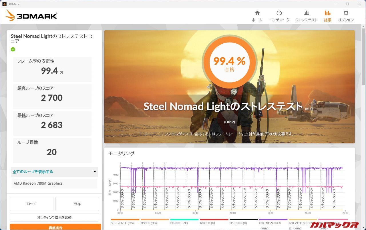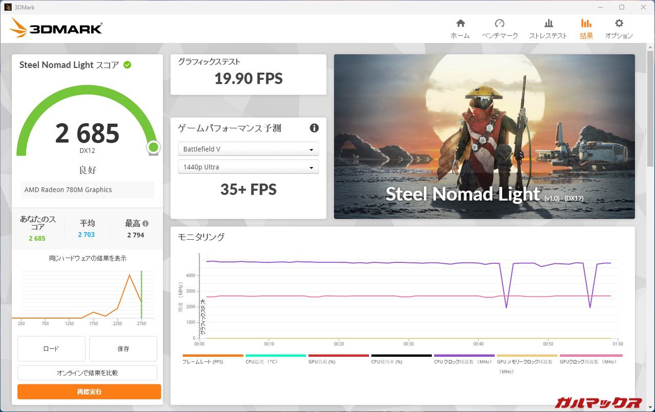 本機はオンボードGPUですが、非常にパワフルなRadeon 780Mを搭載しているのでFHD(1,920×1,080)でゲームがどの程度動くのかチェックしてみます。