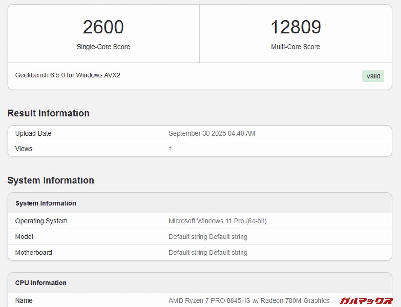 | Geekbench 6 | シングル:2,594 マルチ:12,331 |