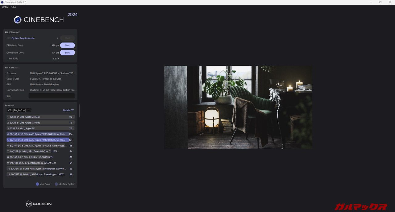 | CINEBENCH R24 | シングル:104 マルチ:826 |