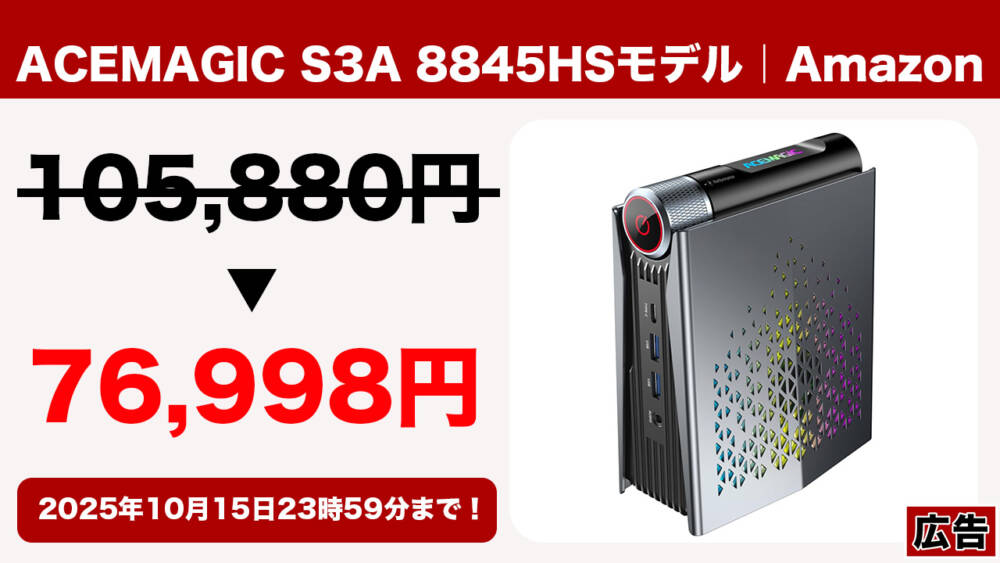 リッチ仕様のR7 8845HS搭載ミニPC「ACEMAGIC S3A 8845HSモデル」が76,998円で買えちゃうぞ!