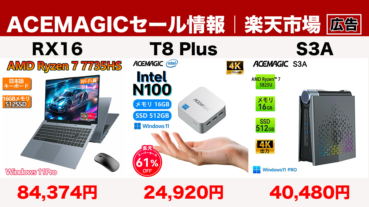 あらゆる性能帯のPCを多数リリースしているACEMAGICですが、楽天で「T8 Plus」「RX16」「S3A」の3モデルがRakutenスーパーSALEでお安くなっているので紹介していきます!