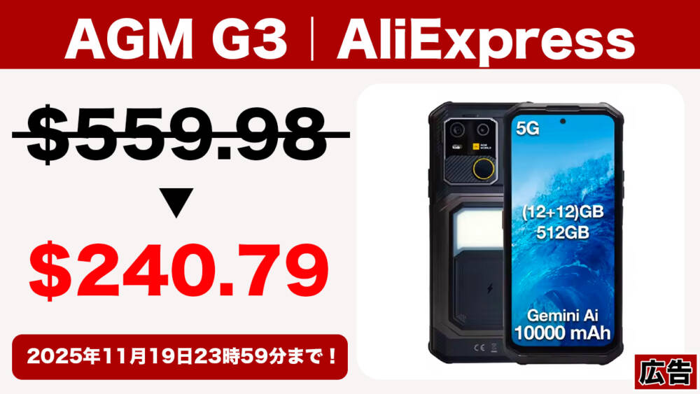 Dimensity 7300搭載タフネススマホ「AGM G3」がAliExpressの1111セールで240.79ドルに!