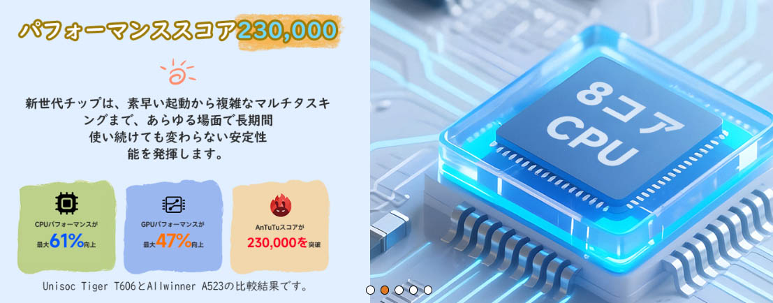 T606やA523と比較して、CPU性能が61%、GPU性能が47%高いそうですが、この性能帯では誤差の範囲で実使用で差を感じることはまずないでしょう。