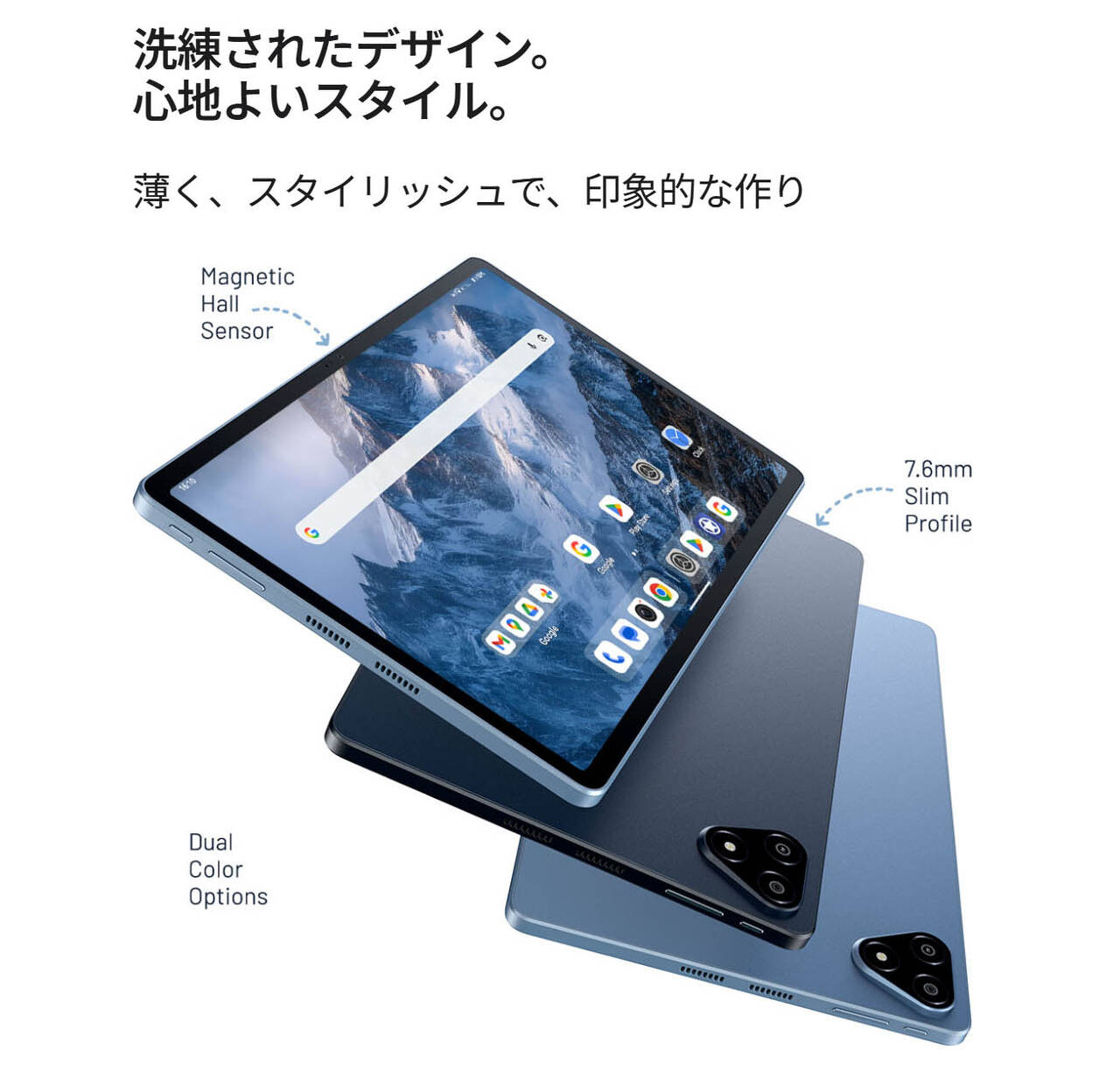 ▼カラーはブルーとグレーの2色。重量は500gで厚さは7.6mmとエントリータブレットでは一般的な値です。↓