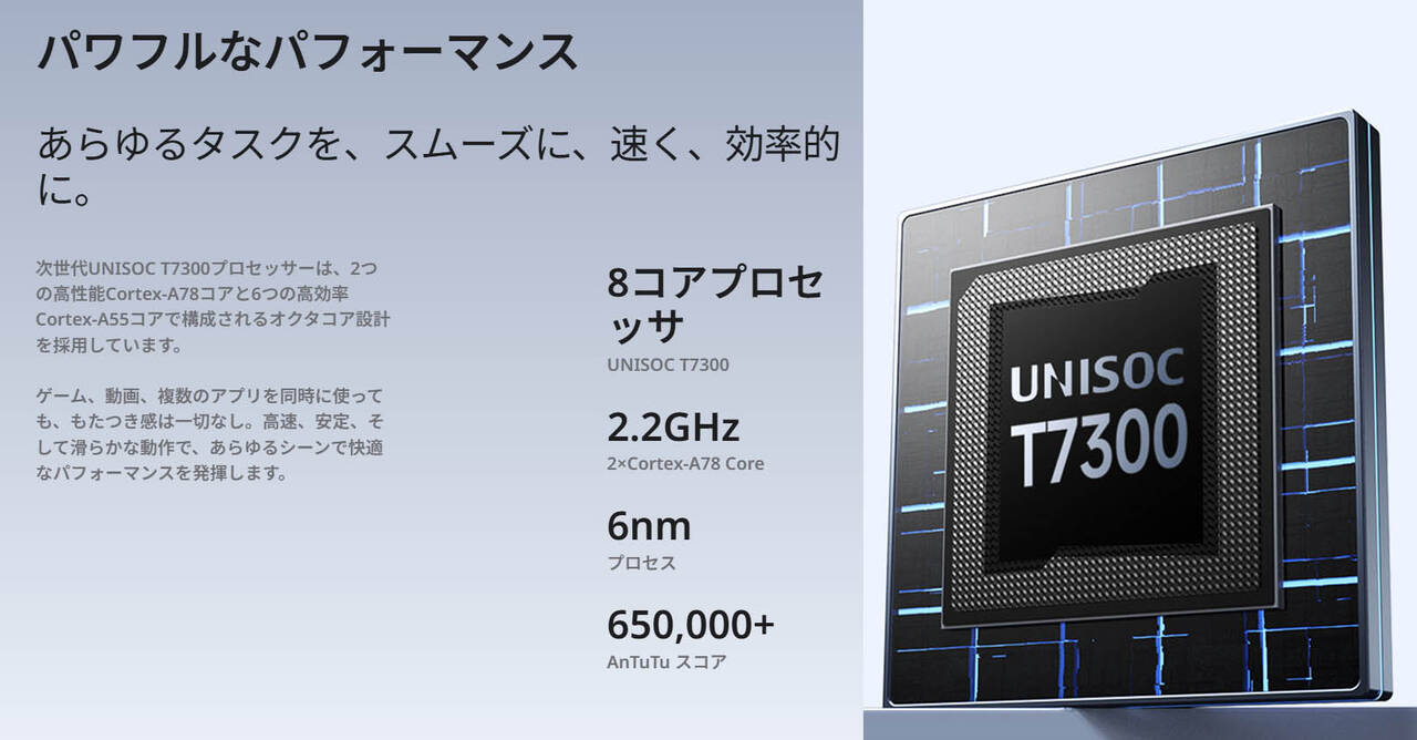 スコア帯のUNISOC T8200やHelio G99よりも、CPU世代やBluetooth規格が新しいため、省電力性能が高くバッテリー持ちにも期待ができます。電力消費の多い大型ディスプレイを搭載していて、動画視聴などでの長時間利用が多くなりがちなタブレットでは重要になってくるかと!