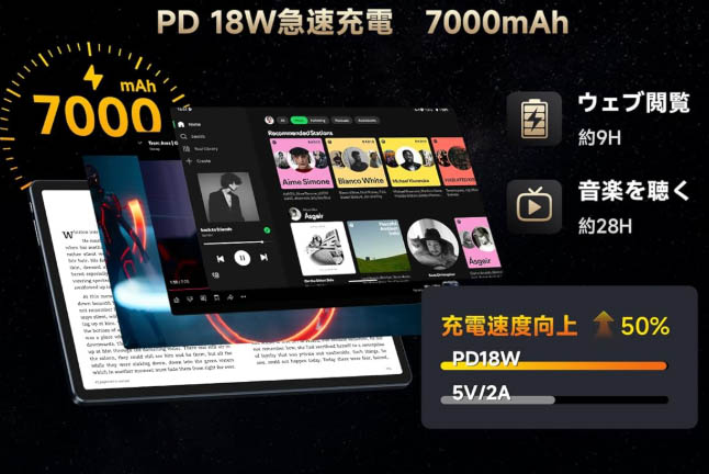 ▼バッテリーは7000mAh。18Wの急速充電に対応しています。↓