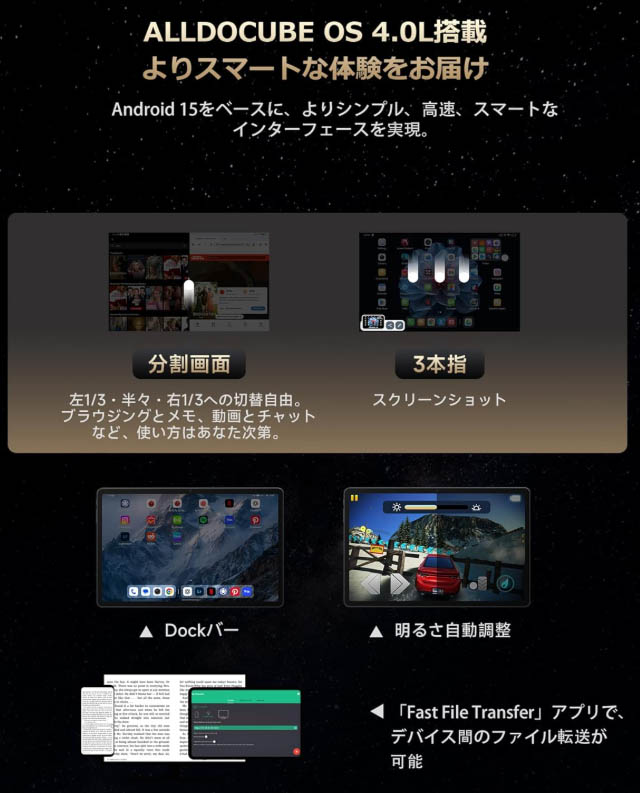 ▼OSにはAndroid 15ベースのALLDOCUBE OS 4.0Lを搭載。あくまでLite版なので同社のUltra PadやiPlay 70 mini Ultraなどよりかは機能がカットされてそうですが、AOSP(ピュアAndroid)のままの他社製品よりは使いやすくなっていると思います。↓