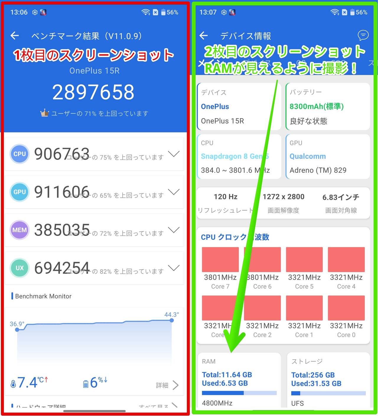 ▼必要なスクリーンショットは2枚あります。[総合スコア][CPU][GPU]の部分が確認できる状態で1枚、RAM(メモリ容量)が確認できる状態で1枚お願いします↓