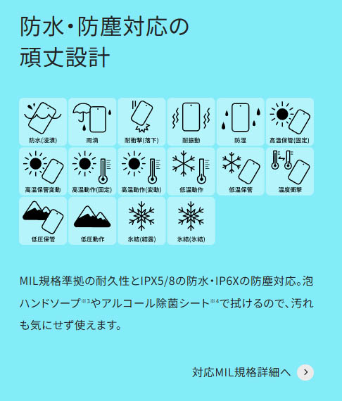 ▼IP6X、IPX5、IPX8を満たす防水防塵性能を備えているだけでなく、MIL-STD-810Hの防水、防水、耐振動、 防湿、高温保管(固定、変動)、高温動作(固定、変動)、低温動作、低温保管、温度耐久、低圧保管、低圧動作、氷結、結露やMIL-STD-810Gの耐衝撃基準をクリアしているようです。↓