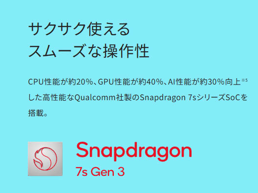 ▼SoCにはSnapdragon 7s Gen 3を搭載。メモリ(LPDDR4X)は6GB/8GB。AnTuTuスコア(v10)は70万点ほどのSoCで、ブラウジングやSNSなどの日常使い程度であれば問題なく使える性能があります。↓