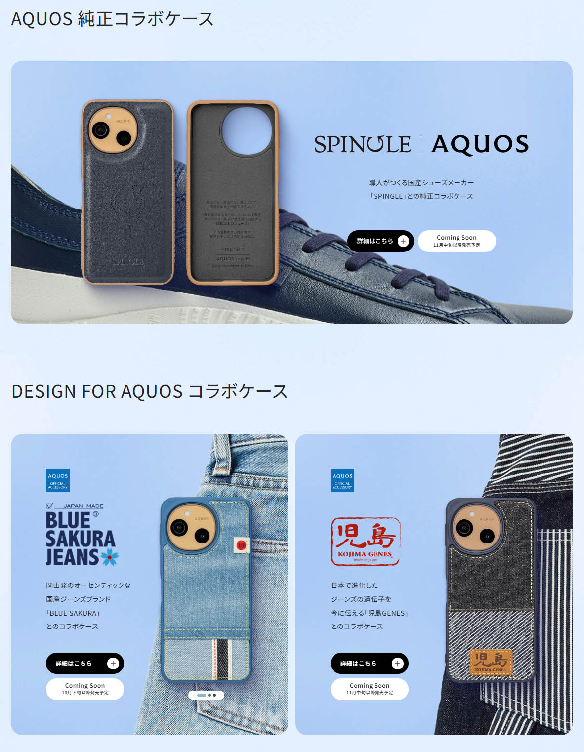 ▼純正アクセサリとして、本体色と同じ色のケースの他、SPINGLEやBlUE SAKURA JEANS、児島ジーンズなどとのコラボケースも用意されています。↓