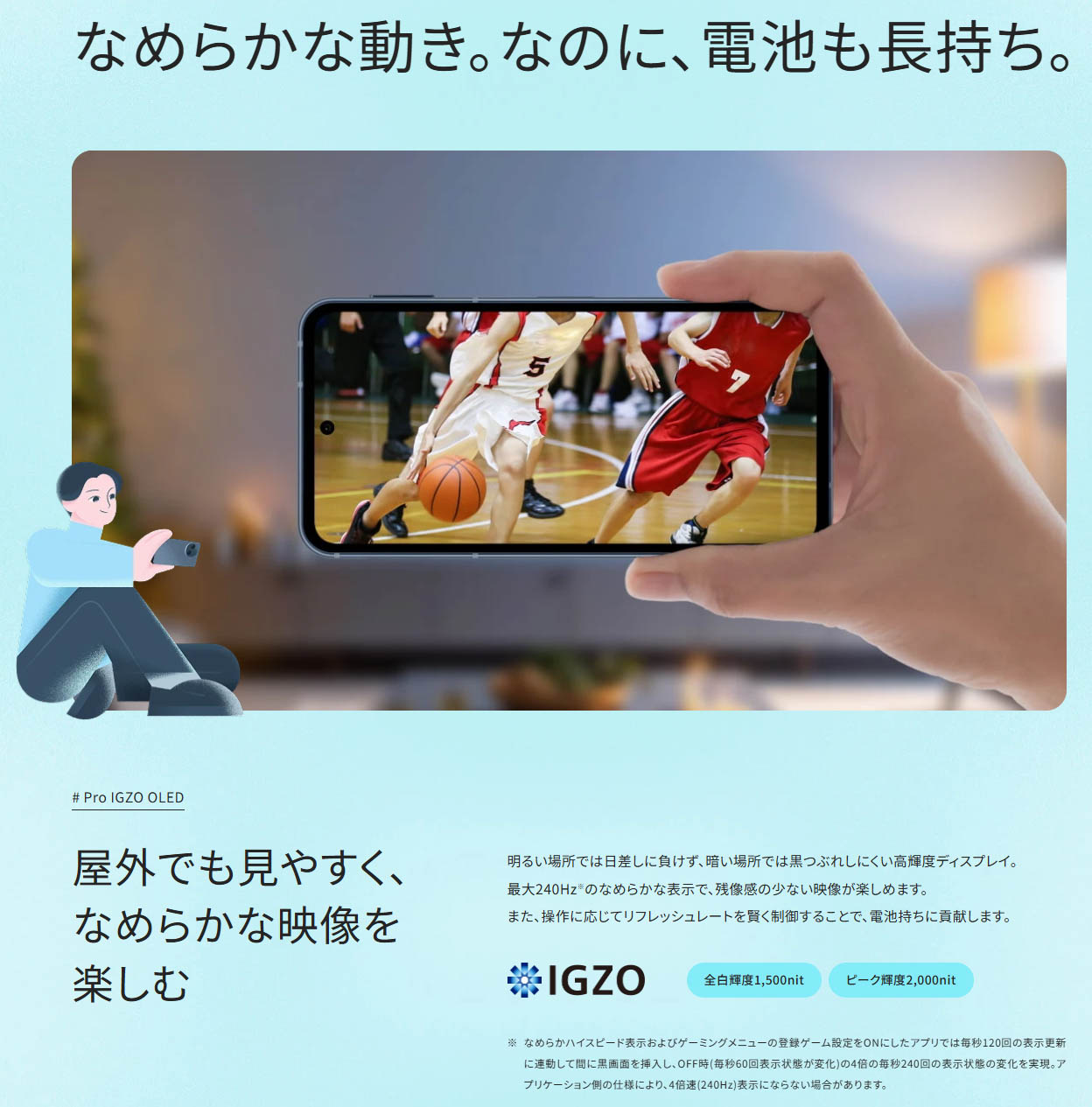 ▼ディスプレイは6.1インチの有機EL。解像度は2340×1080でリフレッシュレートは1-120Hzの可変リフレッシュレートに対応しています。独自機能を利用することで、リフレッシュレートを擬似的に240Hzまで向上させることができるようです。↓