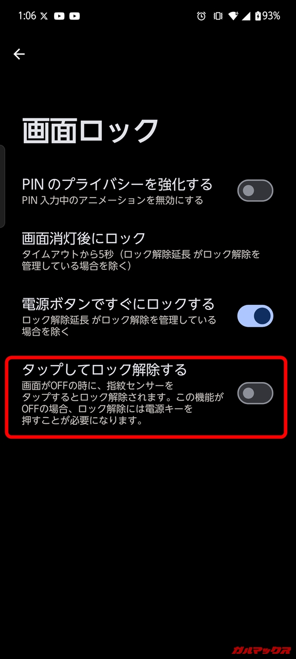 ▼前までは「センサー(電源キー)に触るだけで指紋認証が行われてしまう」のですが、今回は「画面を点灯させてから認証させる」という設定ができるようになっています!マジありがたいこれ。↓
