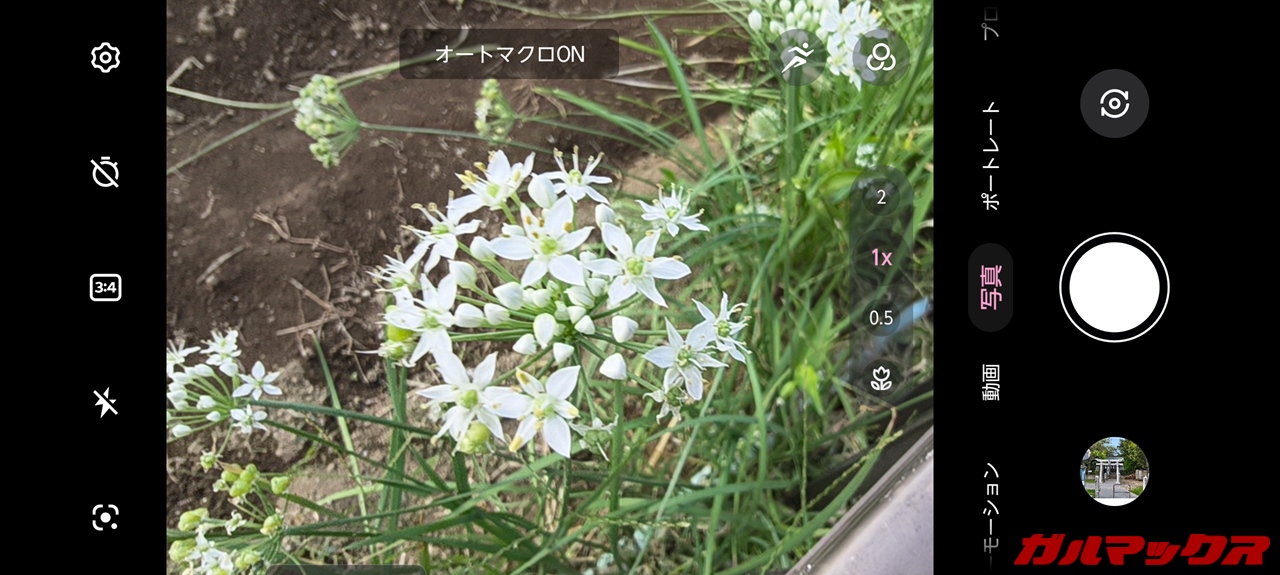 超広角カメラを用いたマクロ撮影では、お花を押すとマクロモードにできるほか、近寄ると自動でマクロモードに切り替えも対応(無効化も可)でした。