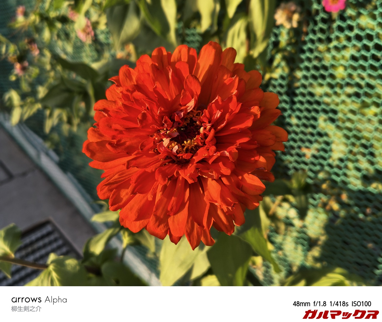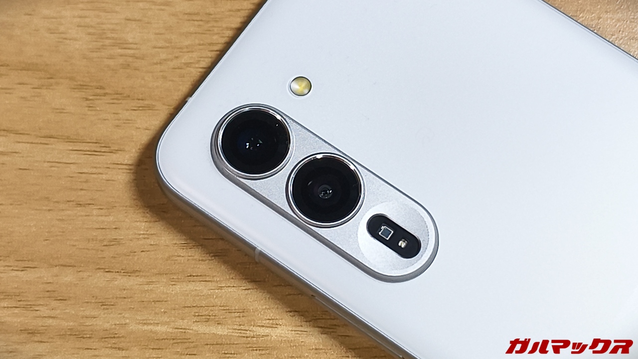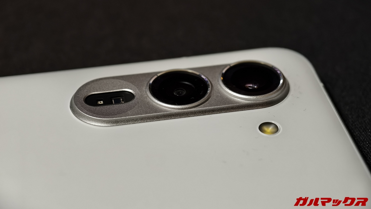 arrows Alphaのカメラはメイン+超広角のデュアル構成。どちらも高画素で約5,000万画素。厳密にはメイン5,030万画素、超広角が4,990万画素だけど正直この差はもう誤差レベルなんで5,000万画素って認識でOK。