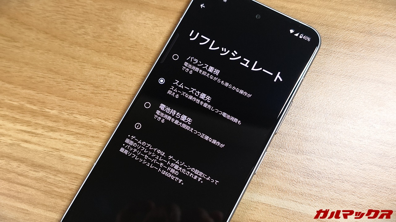 LTPOは、「状況に応じてリフレッシュレートを下げる機能」で例えば待受、WEB、SNSなど静止している表示の場合は自動で1Hzにまでリフレッシュレートを下げることで、電池消費を抑えてくれる機能。