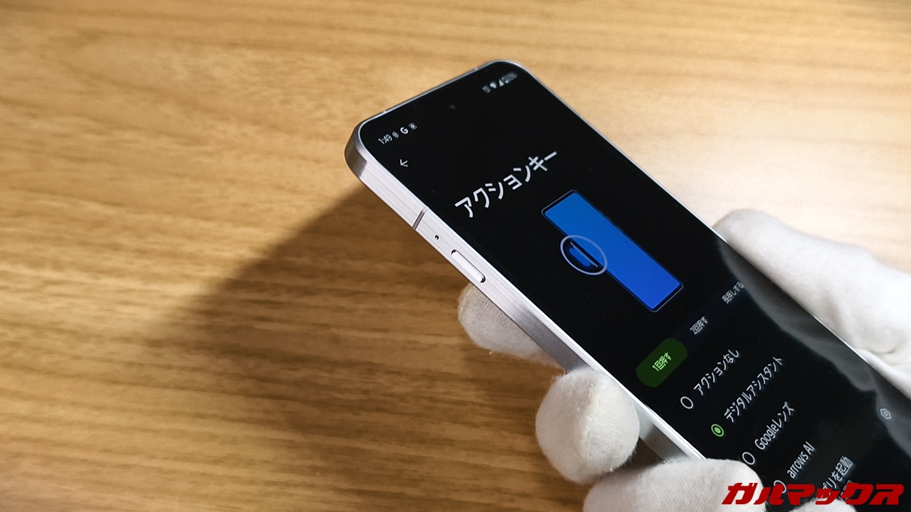 本機の特徴は他にもあり、本体左側に電源、音量とは別に独立したアクションキーを搭載しています。