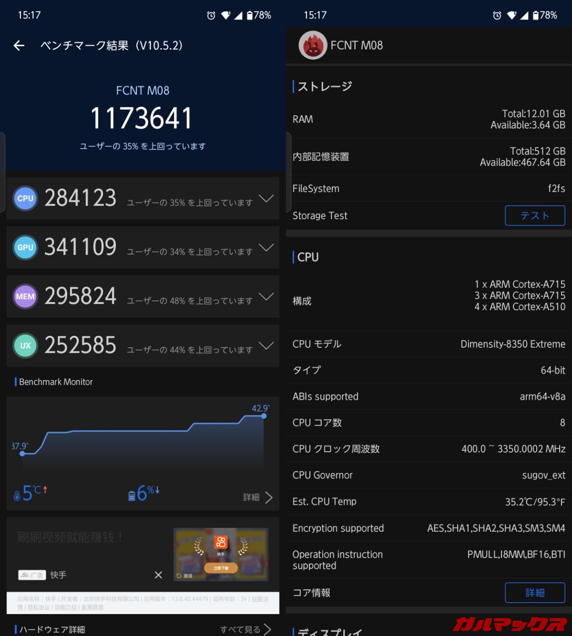 AnTuTuのスコアもDimensity 8350シリーズでよく見かける140万点付近ではなく、110万点前後となったので、発熱による制限がかかっているのかな?という印象です。