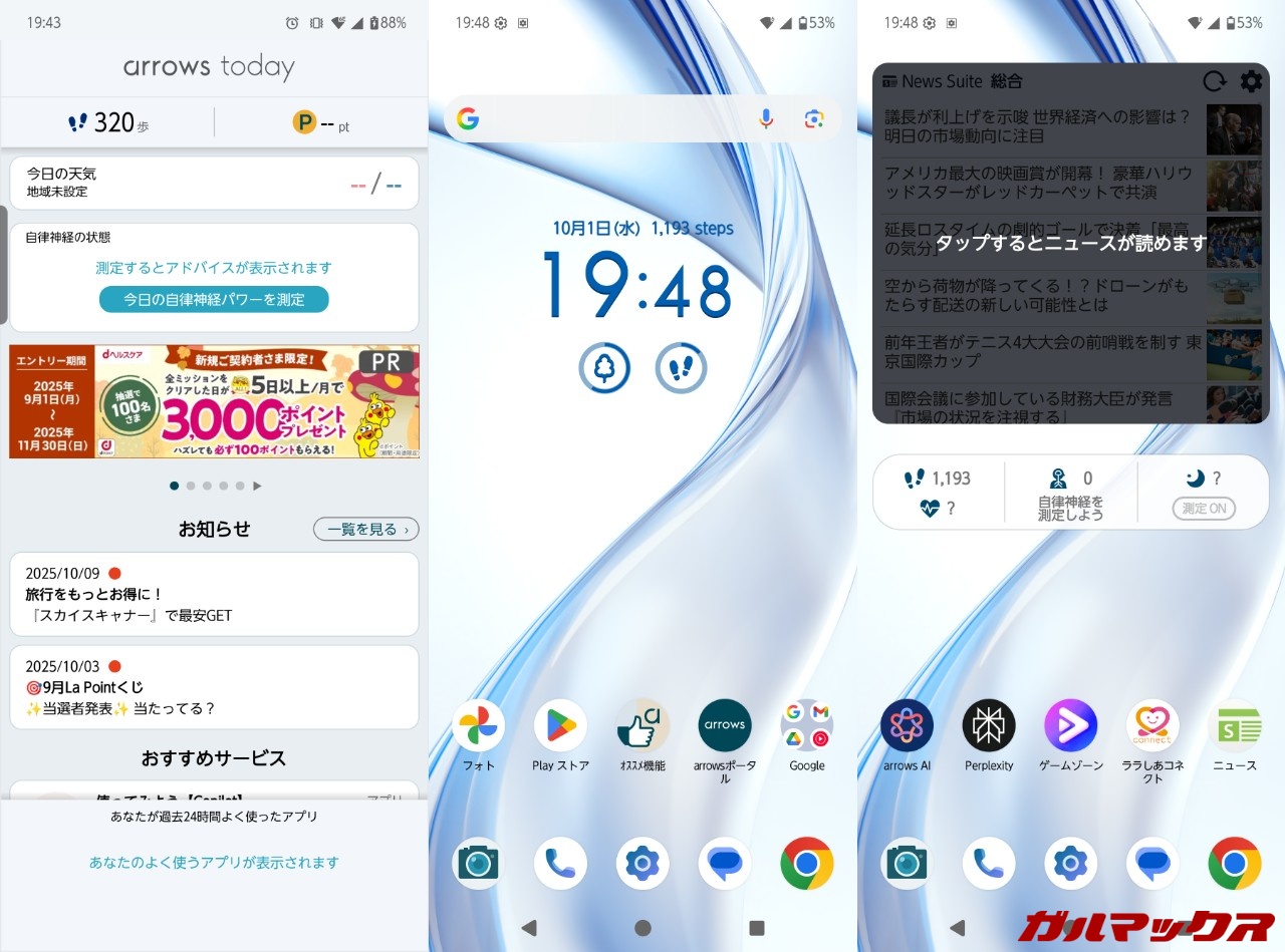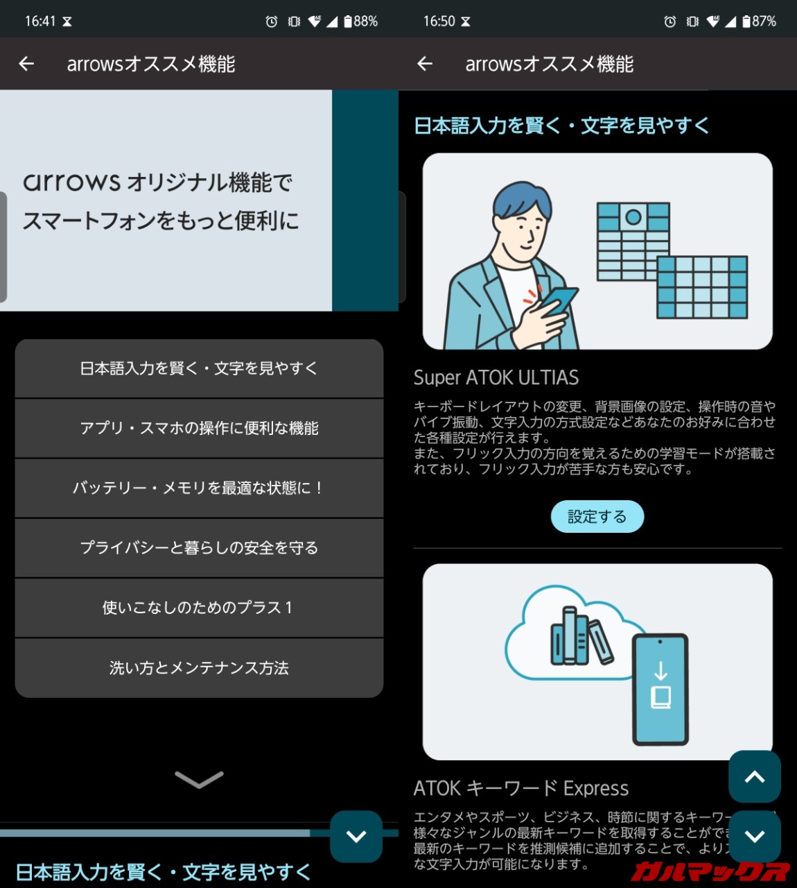 ▼独自機能はアプリや設定だけでなく「arrowsオススメ機能」から使えるのもGood。筆者はこれまで独自機能のたぐいを設定から探して使ってたんだけど、これがあるからマジで探す手間が省けて楽です。↓