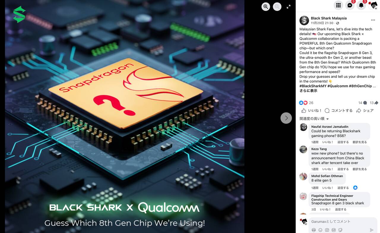 ちなみに情報は、FacebookのBlack Shark Malaysiaという公式アカウントから発信されたものです。これはリリースは確実っぽいですねぇ。