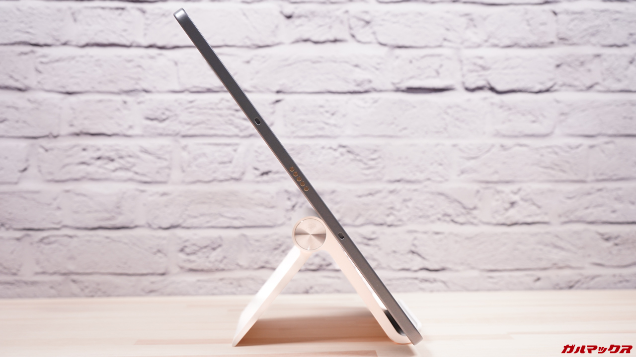 ▼接続はポゴピンでカバーは磁石で固定されるタイプ。背面のカバーを折ってスタンドになるタイプなので設置面積はそこそこ必要です。蓋を締めるとちゃんと自動でスリープになります。↓