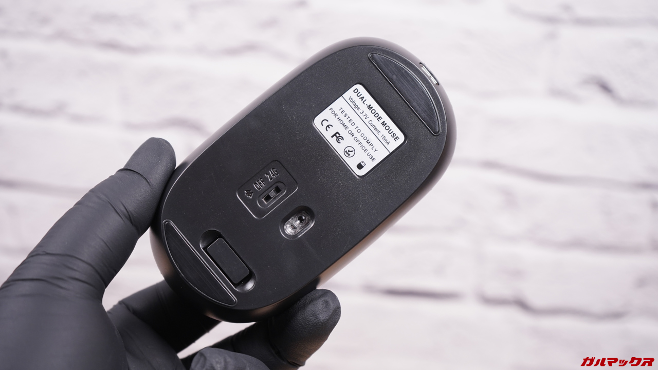 ▼付属マウスはBluetoothと2.4GHzに対応!Blackview MEGA 12はBluetooth、パソコンは2.4GHzという感じで使い分けもできます。切り替えは本体裏のスイッチでモードを切り替えるタイプ。↓