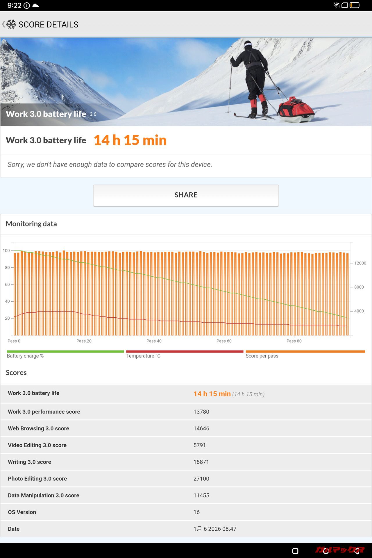 ▼PCMarkのバッテリーテストで輝度を110(iPhoneの中間設定くらい)に専用機器で合わせて60Hz固定で測定した結果は100%→20%で14時間15分となりました。↓
