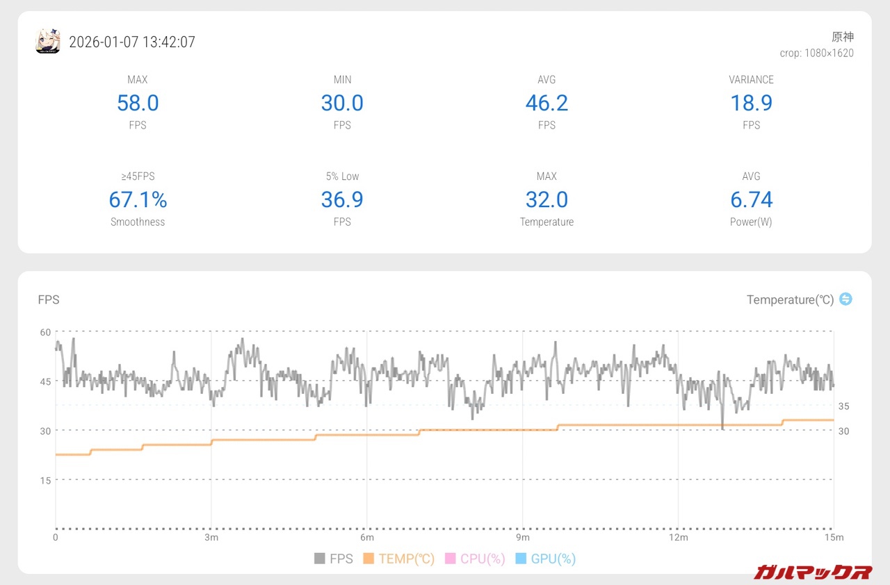▼原神(画質は中設定でフレームレートは60)を15分ほど元素爆発など使いながら狩りプレイした結果は以下の通り。↓