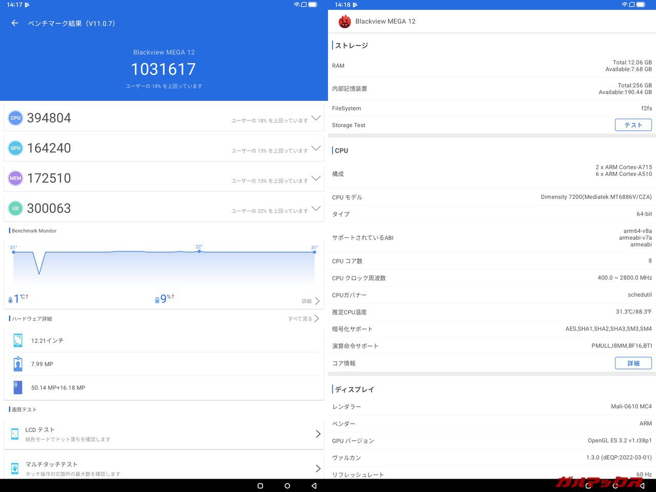 ▼AnTuTu(Ver11)スコアは総合が1,031,617点、GPUが164,240点でした。↓