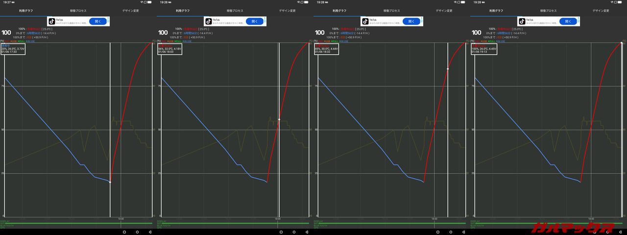 ▼充電は付属の55W充電器を使って20%→100%まで充電してみました。30分で36%、1時間で65%ほど充電できています。↓