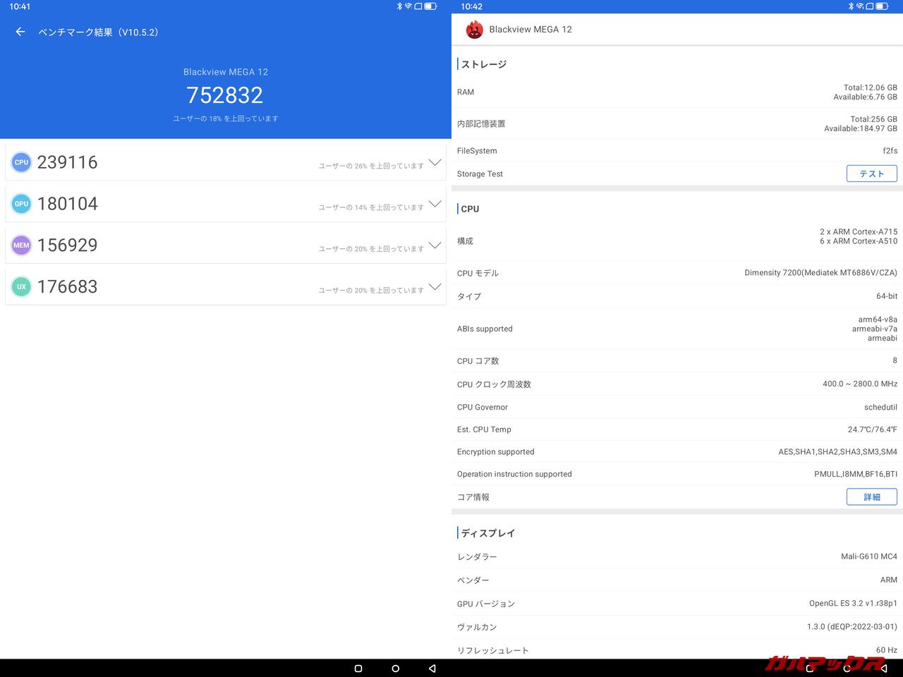 ▼AnTuTu(Ver10)スコアは総合が752,832点、GPUが180,104点でした。↓