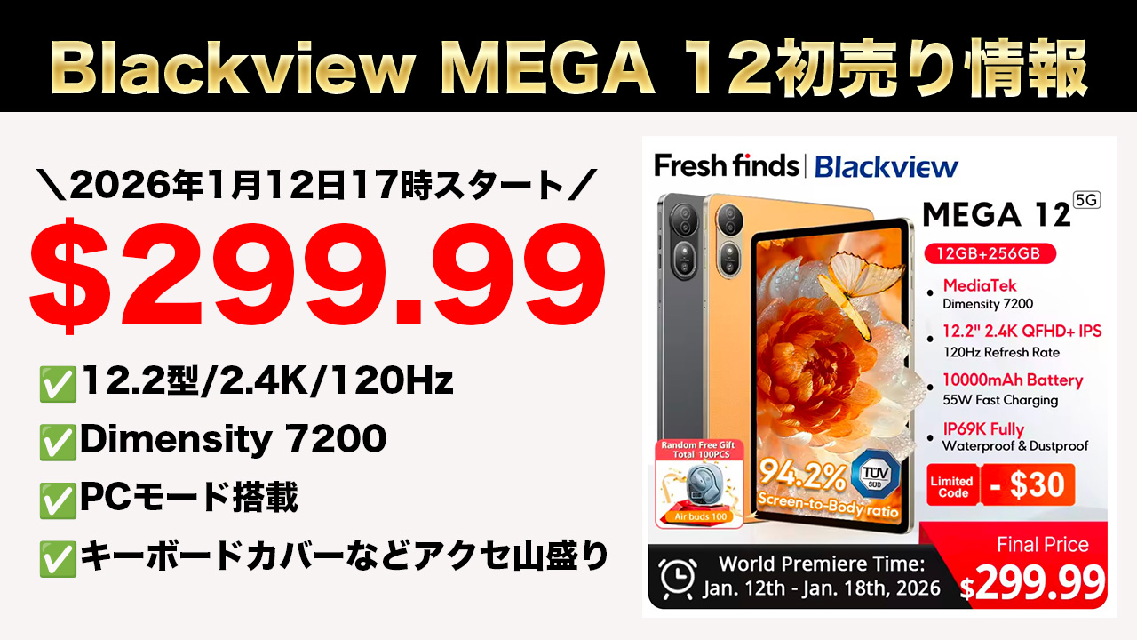 日本でも製品展開しているBlackviewが投入する新型の12.2型タブレット「Blackview MEGA 12」の初売りが2026年1月12日17時よりAliExpressでスタートするようです。めちゃくちゃ安いので欲しい人は初売りを狙いましょう。